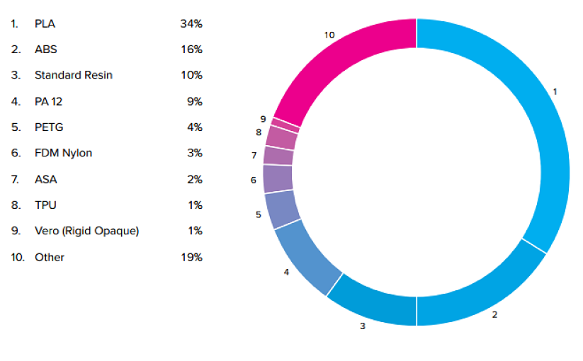不論是3D列印的新手或行家,回答PLA和ABS幾乎是反射動作了。資深的朋友還會舉出PETG、TPE、Nylon或是其他材料。根據3D Hubs的統計數據顯示,名列FDM材料使用的前三大也確實為PLA(34%)、ABS(16%)與PETG(4%)